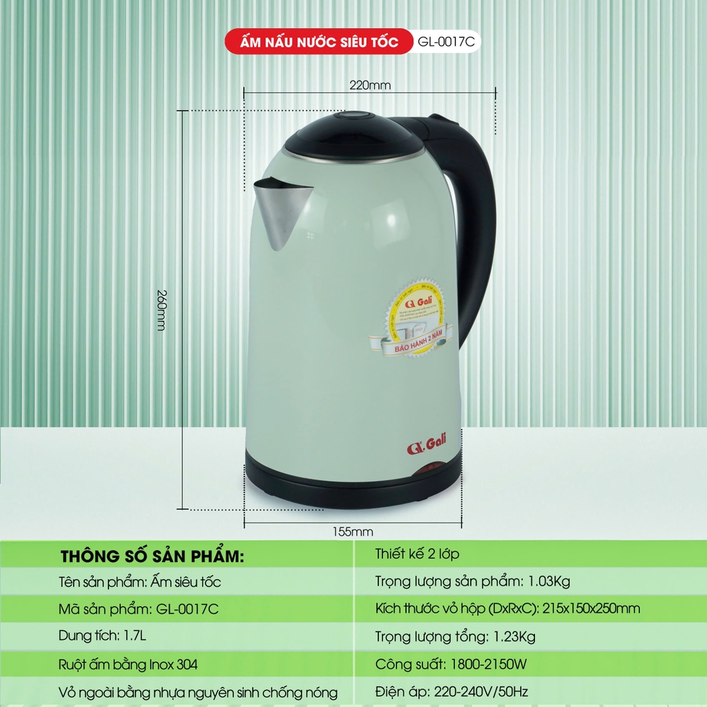 Gali GL-0017C sở hữu dung tích 1.7 lít, đáp ứng nhu cầu sử dụng nước sôi nhanh chóng cho cả gia đình, văn phòng hay cá nhân. Với công suất từ 1800W đến 2150W, ấm giúp: