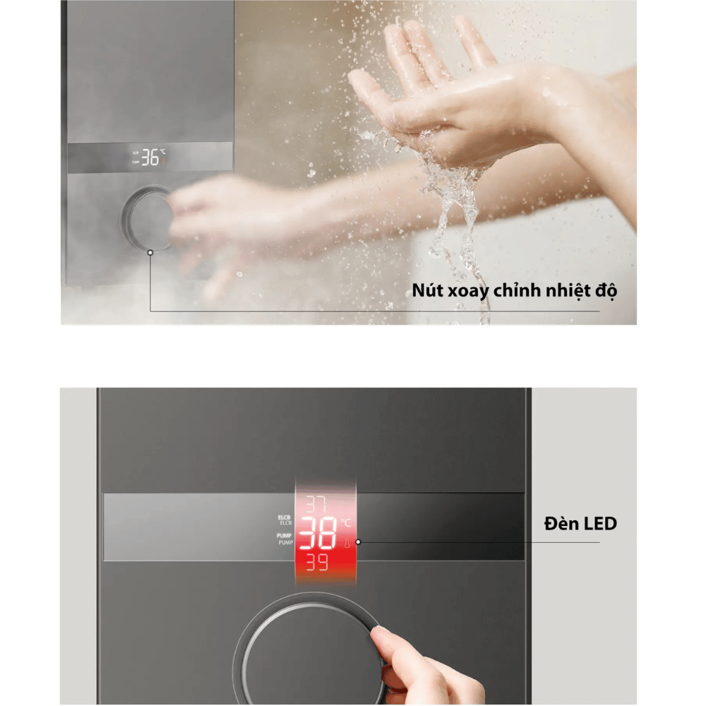 Người dùng có thể dễ dàng kiểm soát nhiệt độ nước với màn hình LED hiển thị rõ nét và nút xoay điều chỉnh nhiệt độ 2 chiều chống trơn trượt. Thiết kế tiện lợi này phù hợp với mọi đối tượng sử dụng, đặc biệt an toàn và dễ thao tác.
