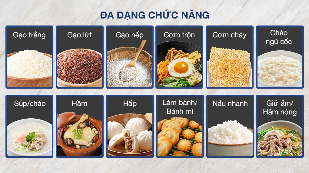Tiện ích: Hẹn giờ nấu xong, giữ ấm 24 giờ, xửng hấp, điều chỉnh thời gian nấu