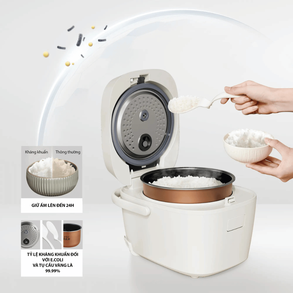Không chỉ đảm bảo chất lượng cơm, nồi còn chú trọng đến sức khỏe người dùng với lớp phủ kháng khuẩn trên lòng nồi, nắp và thìa. Lớp phủ này giúp tiêu diệt vi khuẩn như Escherichia coli và tụ cầu vàng lên đến 99.99%, an toàn tuyệt đối cho người già, trẻ em và phụ nữ mang thai. Cơm cũng giữ được độ thơm dẻo lên đến 24 giờ mà không lo thiu.