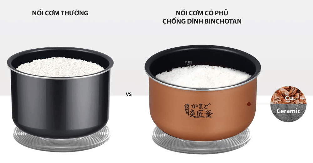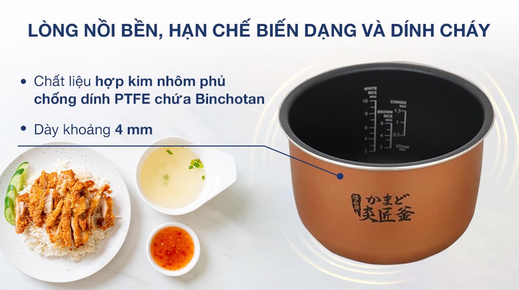 Lòng nồi được chế tạo từ hợp kim nhôm phủ chống dính PTFE chứa Binchotan dày 4mm, giúp dẫn nhiệt nhanh, tỏa nhiệt đều, kết hợp lớp phủ đồng bên ngoài để gia tăng độ bền và tuổi thọ sản phẩm.