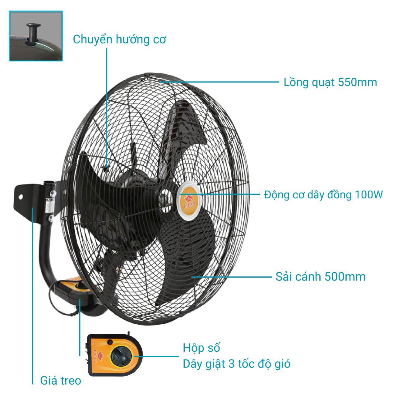 - Sản phẩm được trang bị 3 cánh quạt ,đường kính cánh quạt 500 mm và có 3 tốc độ điều chỉnh gió khác nhau, giúp bạn lựa chọn tùy theo nhu cầu sử dụng.