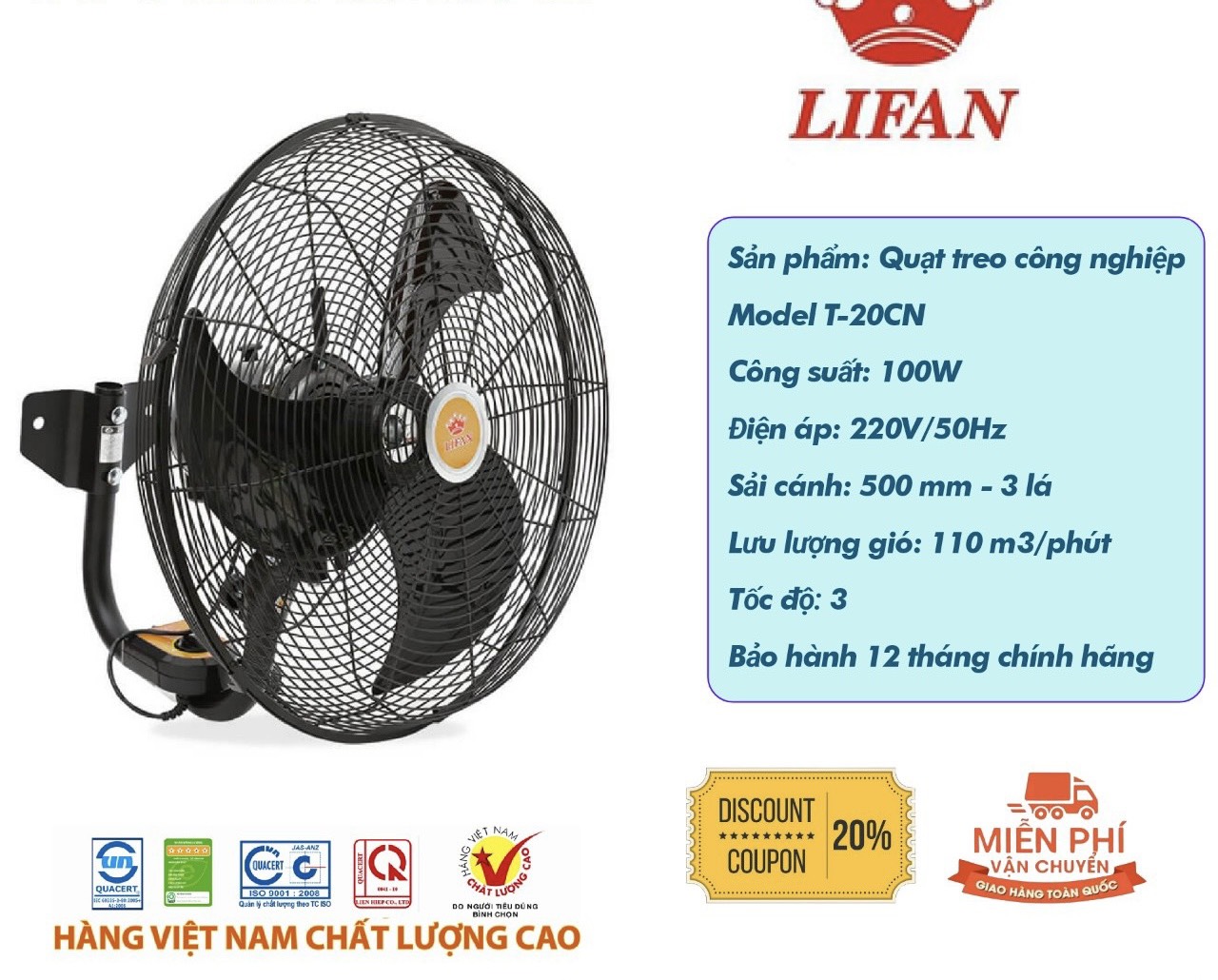 - Quạt treo công nghiệp Lifan T-20CN hoạt động mạnh mẽ với công suất 100W cho khả năng tạo gió mát khắp không gian lắp đặt quạt.
