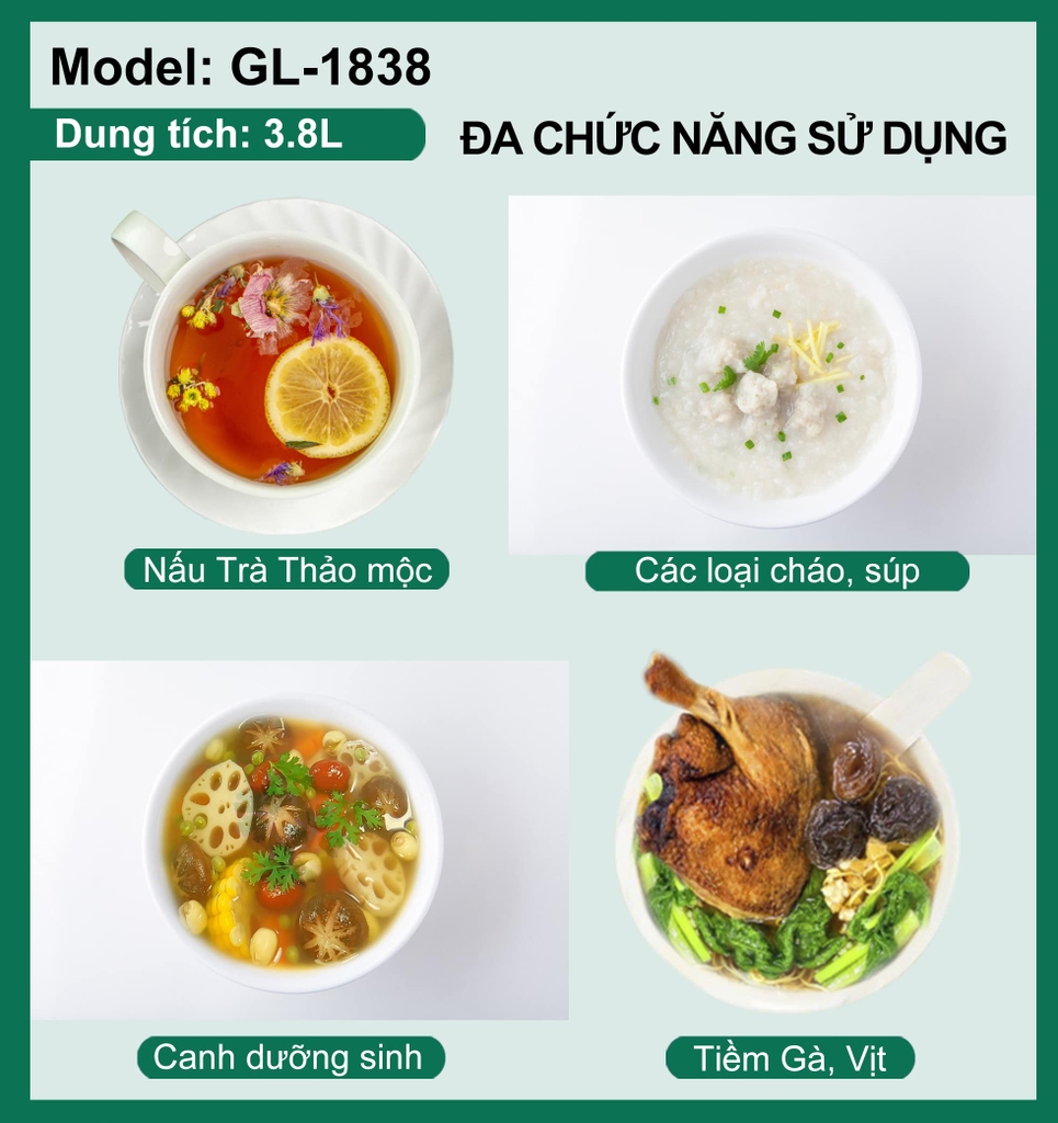 - Đa chức năng nấu sắc các loại thảo dược, canh dưỡng sinh, trà thảo mộc, tiềm thực phẩm, tiện lợi.