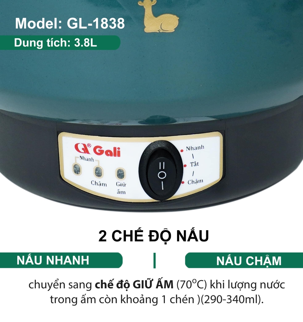 - Công tắc 3 chức năng nấu nhanh, nấu chậm, tắt nguồn theo nhu cầu sử dụng.